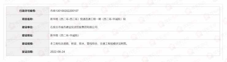 新华路(西二环-西三环)快速连通工程一期(西二环-华诚街)段新获建设工程规划许可证,建设单位为石家庄市城市建设投资控股集团有限公司,建设地址为新华路(西二环-华诚街)。建设规模为本工程包含道路、桥梁、排水、管线综合、交通工程规模详见附图。行政许可编号: 市政137